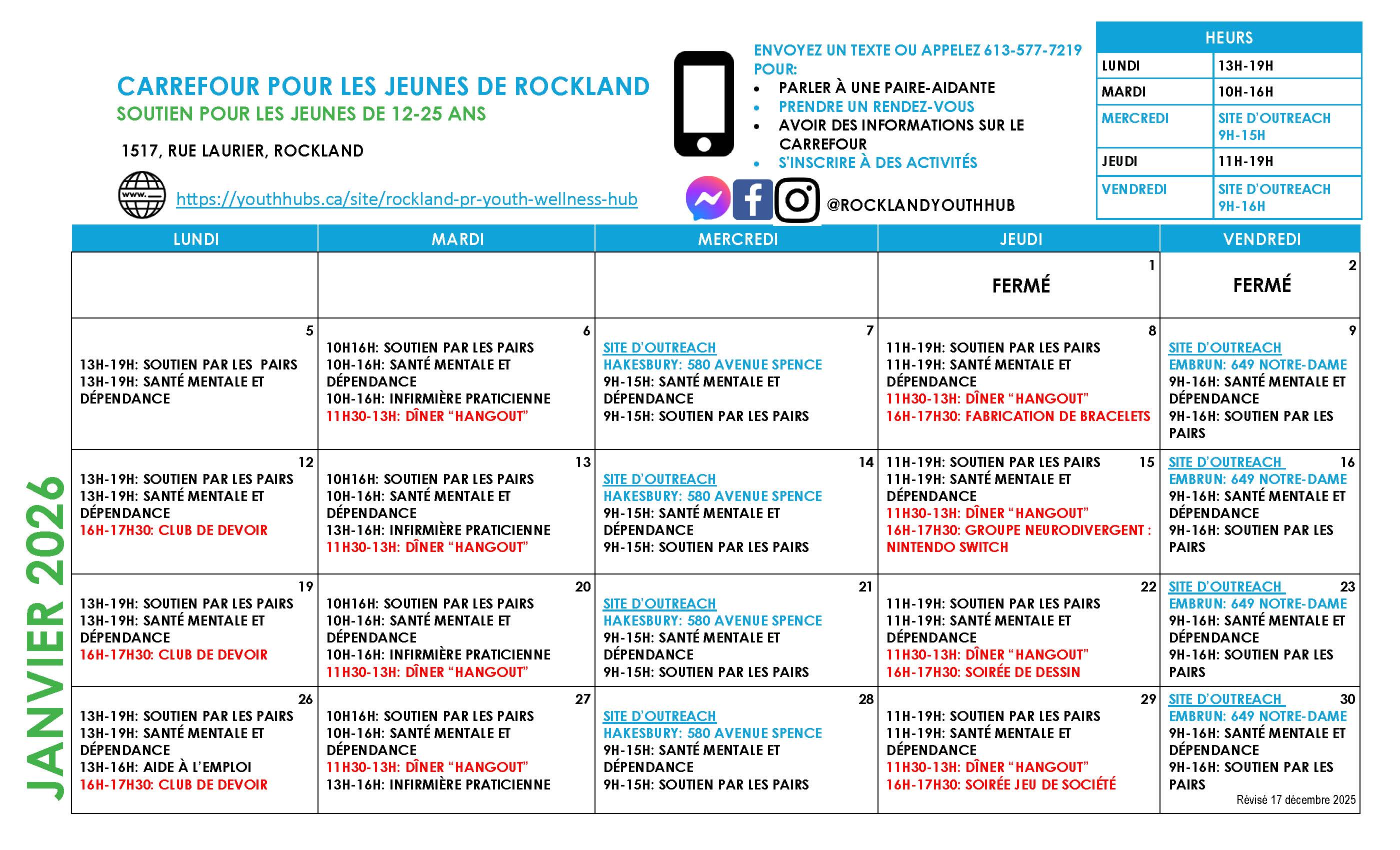 Le Carrefour bien-être pour les jeunes de Rockland et Prescott-Russell offre des services à partir de son centre de services principal à Rockland et des deux centres de service à Hawkesbury et à Embrun.