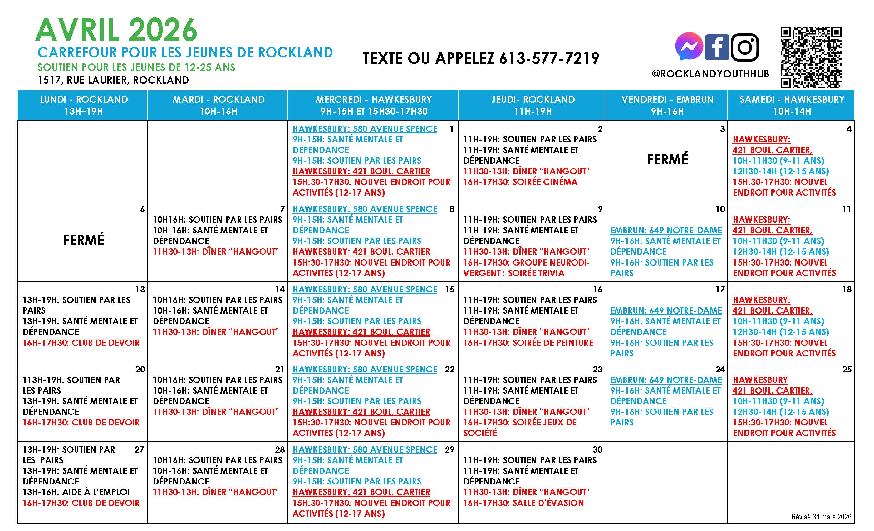 Téléphone à Rockland : 613 577-7219 ou 613 361-6363, poste 8728