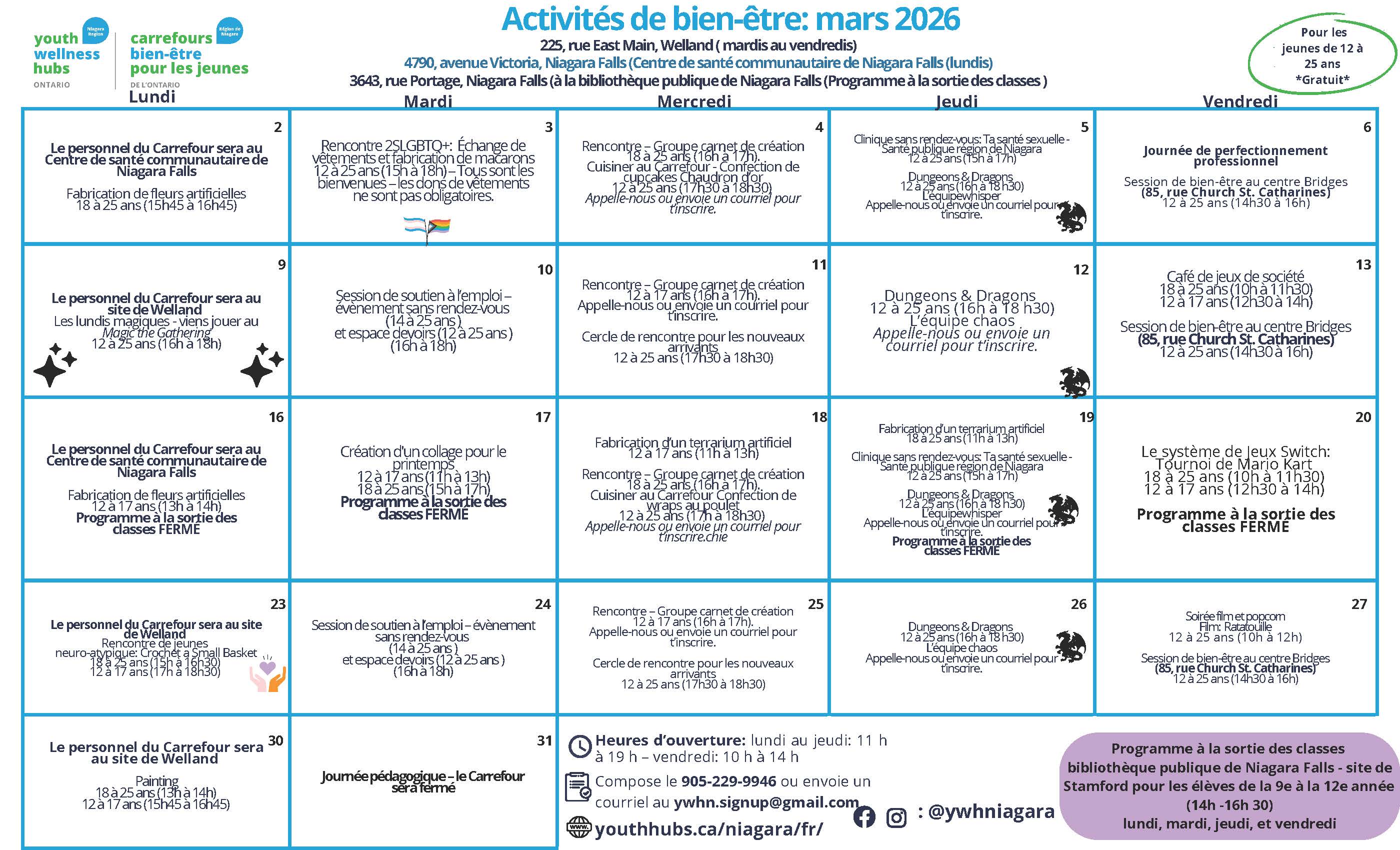 Pour plus d'informations, appelle au 905 229-9946 ou envoie un courriel à ywhn.signup [at] gmail.com.