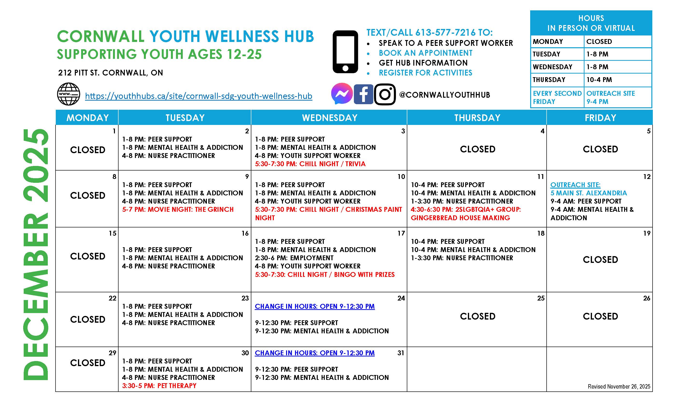The Cornwall & SDG Youth Wellness Hub provides services from the main location in Cornwall and one outreach site in Alexandria.